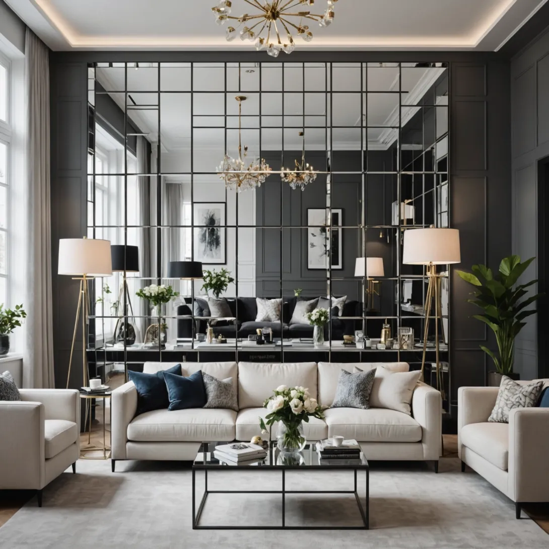 - Гостиная с зеркальными квадратами: Размещение наклеек в виде сетки на одной из стен создаёт иллюзию зеркальной панели, придающей комнате глубину и визуальное расширение.